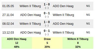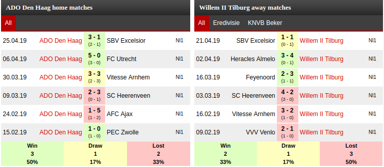 - Reverse fixture ended with Ado Den Haag winning 3-0 against Willem II. The hosts are expected to put on a rock –solid defensive display as they are hoping for another win at home turf.