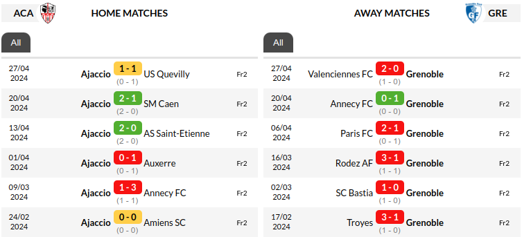 While both teams haven’t been in peak form recently, they have displayed some consistency. Ajaccio has managed two wins, two draws, and two losses in their last six matches. Grenoble, on the other hand, has secured two victories, one draw, and three losses in the same period. However, the head-to-head record favors Ajaccio. They are unbeaten in their last four encounters against Grenoble (three wins and one draw), with their last Ligue 2 victory over them coming in November with a convincing 3-0 win at Stade des Alpes.