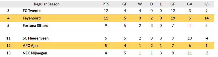 Ajax currently occupies the 12th position with five points after competing in four matches. In their most recent Eredivisie match, they suffered their first defeat of the season, losing 3-1 to Twente. This loss also extended their ongoing winless streak.
