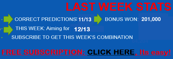 CONGRATS TO EVERYONE WHO USED OUR TIPS LAST MIDWEEK. WE MANAGED TO GET 11/13 AND WON 201K IN THE PROCESS. OUR TARGET THIS WEEK IS 12/13 AND ARE SURE OF AT LEAST 10 GAMES. CLICK HERE TO SUBSCRIBE FOR FREE