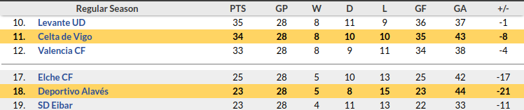 - Alaves (19th ) take on Celta Vigo (11th ) at Estadio Mendizorrotza (Vitoria-Gasteiz) for Match day 29 in La Liga.