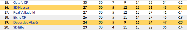 - Huesca has picked two massive wins in their last two matches, and in the process moved out of the bottom three a point above Elche.