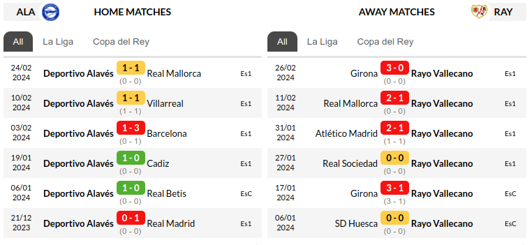 - Alavés (mid-table) and Rayo Vallecano (just above the relegation zone) are both in inconsistent form. Alavés haven’t won in five games (three draws, two losses), while Rayo Vallecano are winless in their last eight (three draws, five losses).