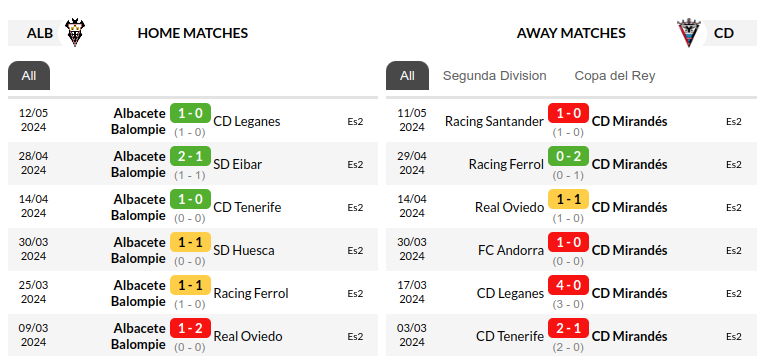 The last encounter between these two sides in December saw Mirandés secure a 2-0 victory at Estadio Municipal de Anduva. Albacete will be looking to avenge this defeat and potentially extend their unbeaten run against a vulnerable Mirandés team.