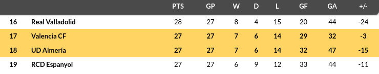 - Valencia is currently tied on 27 points with Almería, and this season has been their worst in the three-points-for-a-win era.