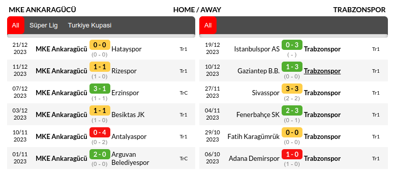 In their previous Süper Lig meeting, Trabzonspor triumphed 2-0 at Papara Park last season, with Umut Bozok scoring in the 46th and 62nd minute.