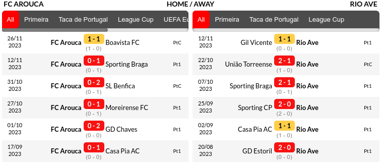 In their last six league matches, Arouca has won one and lost five, while Rio Ave has won one, drawn two, and lost three in their recent six outings.