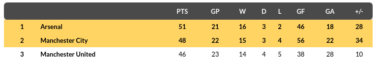 - The league leader’s lead has been cut to just three points and a defeat at Emirates will see them drop to 2nd in the table on goal difference.