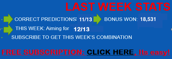 CONGRATULATIONS: WE WON A BONUS OF 55K FOR 10/13 CORRECT MIDWEEK JACKPOT PREDICTIONS LAST MINI JP. WIN A BONUS FOR 12/13. WE ARE SURE OF 11 GAMES AND WILL USE DOUBLE CHANCES IN THE OTHER 2. CLICK HERE TO REGISTER