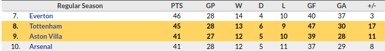 - Mourinho side are four points above Aston Villa and three outside the top five places.