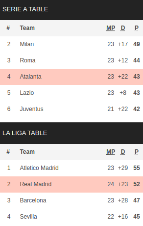 - Atalanta are currently 4th on the Serie A with 12 wins from the 23 played with 7 draws and four losses.