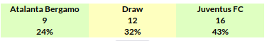 - Juventus have one win from the last six meetings of this encounter so as Atalanta.