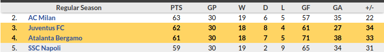 - They currently just two points above Napoli and two behind 2nd placed AC Milan.