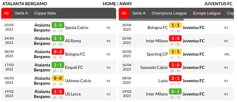 - For Juventus, finally getting back to winning ways with a 2-1 win over Lecce last time out after four failed attempts in SA (D1, L3) means they are not in immediate danger of losing their coveted top-four spot should things not go their way this weekend, after their previously deducted points were recently reinstated.