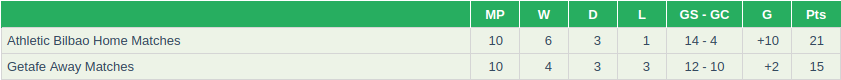 Athletic Bilbao Vs Getafe Prediction: Home and away Form