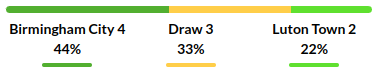 - Birmingham has been unbeaten in their last three Championship matches against Luton, winning two and drawing one, while Luton is looking for their first league win against Birmingham since February 2021.