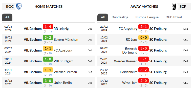- Freiburg hold a clear dominance in recent encounters, winning the last four meetings against Bochum and outscoring them 8-1 during this streak. Their last victory came in October with a 2-1 scoreline.