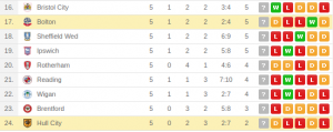 - They are at position 18 on the table with 16 points having won four games, drawn four and lost five.