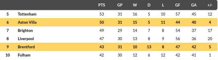 - They are in sixth place with 50 points, trailing Tottenham Hotspur by three points for a Europa League spot.