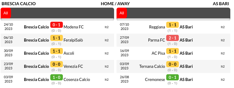 In their last Serie B encounter, Bari secured a 2-0 victory over Brescia at Stadio Mario Rigamonti last season.