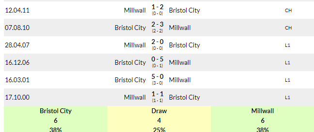 Bristol City Vs Millwall Predictions:H2H