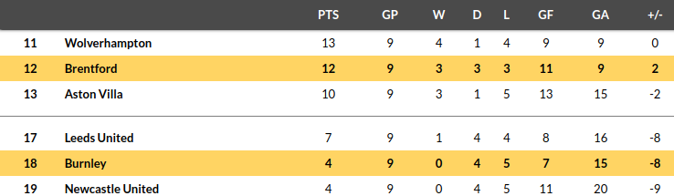 - Burnley are still searching for their first win of the season and remains in the bottom three with just four points from nine matches.