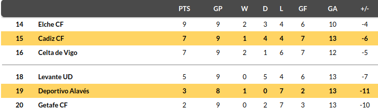 - Cadiz CF has achieved just 1 wins of their last 12 La Liga games.