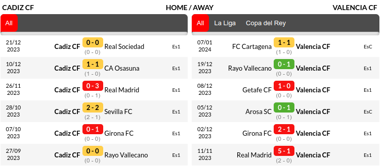 In their recent six league matches, Cádiz has drawn five and lost one, while Valencia won two, drew two, and lost two.
