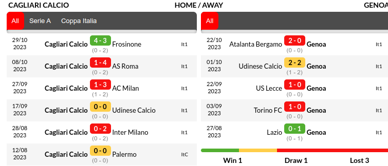 Claudio Ranieri’s squad aims to secure back-to-back SA wins for the first time since January 2022. To do so, they’ll have to break a five-game losing streak against Genoa. Despite their losses, they haven’t been outclassed, with four of those defeats ending in a 1-0 scoreline. Given recent form, Cagliari would likely settle for conceding just one goal, especially considering they’ve allowed ten goals in their last three home games.