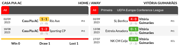 Casa Pia, on the other hand, secured a 1-0 victory in their last Primeira Liga match at Estádio Municipal de Arouca against Arouca, extending their unbeaten streak to three matches, including one win and two draws.