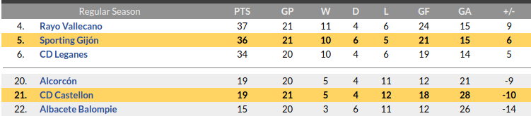 - Sporting Gijon are currently in the play off places 17 points above their Weekend opponents.