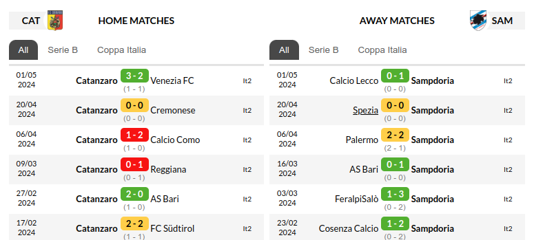 While both teams are aiming for promotion, their recent form presents a contrasting picture. Catanzaro has managed two wins and two losses in their last six matches, while Sampdoria has secured two wins, three draws, and one loss in the same period. However, in their previous encounter this season, Catanzaro emerged victorious with a 2-1 win at Stadio Comunale Luigi Ferraris in October.