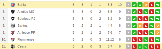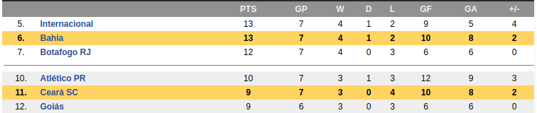 - Bahia head into this match at position 6 with four wins one draw and two defeats.