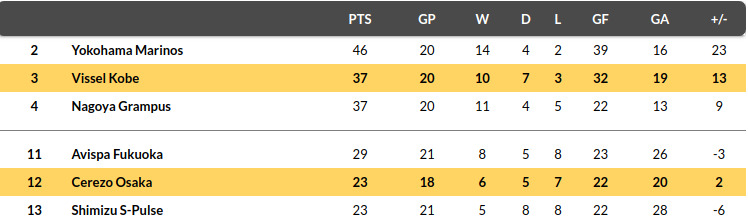 - Vissel Kobe is in a rich vein of form with five straight wins. Kobe is in the top three with ten wins from 20 matches played with just 3 defeats.