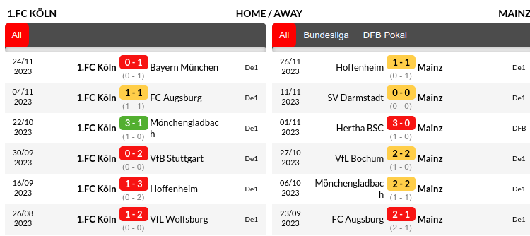 Despite having the Bundesliga’s least prolific attack with only ten goals, Cologne secured a narrow 1-0 victory over Darmstadt last weekend, lifting them out of the bottom three before this round. Facing another encounter against struggling opponents could be precisely what the team needs, as they host fellow strugglers Mainz after garnering seven of their modest nine points against teams in the bottom half (W2, D1, L2).