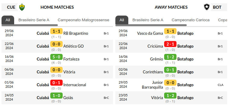 While Cuiaba has historically finished behind Botafogo in the past two seasons, they’ve dominated their recent head-to-head encounters. Victories in three of the last four meetings showcase their dominance, including a narrow 1-0 win in the most recent clash last October.