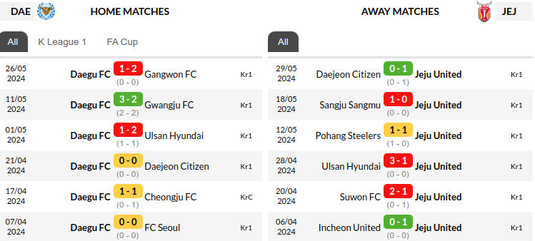 Historically, Daegu FC has held a slight edge over Jeju United. In their last six encounters, they have emerged victorious on three occasions. However, recent form suggests this trend may not continue.