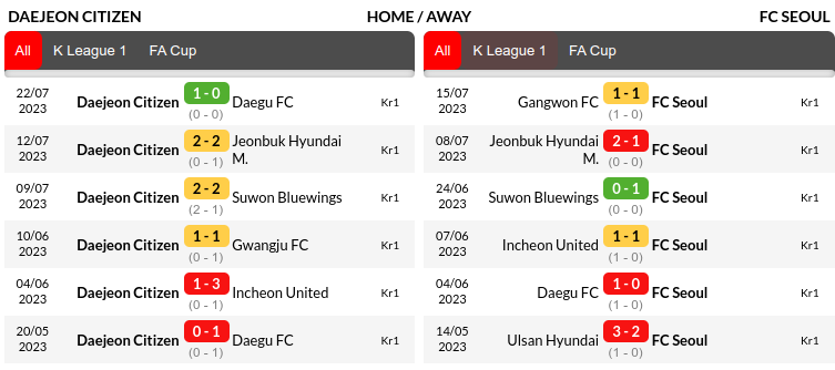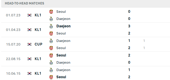 Over the course of the last five meetings between the two teams, Seoul has emerged victorious twice, Daejeon has secured one win, and the remaining encounters have ended in draws.