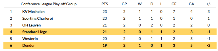With just 4 points separating the top six in this First Division A playoff group, every match carries extra weight. Standard’s away form will be tested against a Dender side that won their only previous home playoff match.