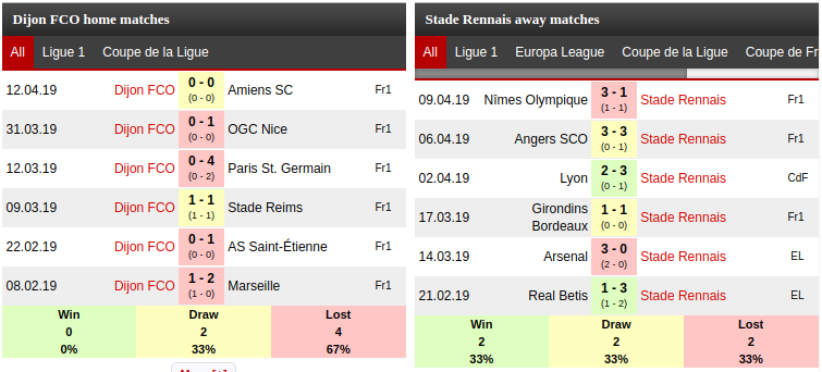 - Rennes form has depleted ever since they were eliminated from the Europa league round of 16 by Arsenal, with just one win in a cup tie and failing two win six of their last seven encounters.