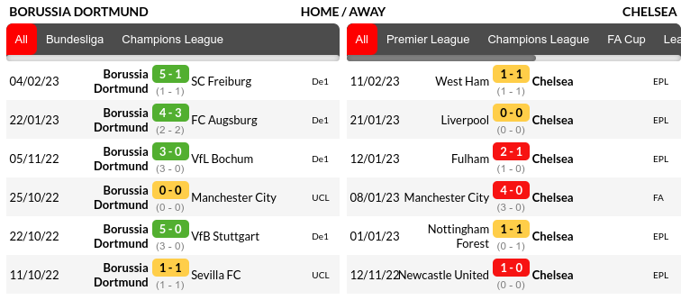 - Dortmund has a winless record in their last 12 matches against British clubs, but they will hope to end that run against Chelsea. Emre Can will be key in stopping Chelsea’s Kai Havertz, who has a poor record against Dortmund. Dortmund has lost three of their last six home matches in the UCL last-16 stage.