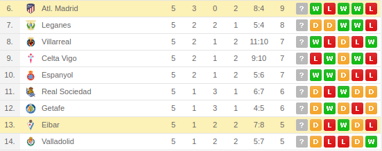 - As guests, Atl. Madrid are three loses failing to score in all of them and two wins where they kept a clean sheet in both in their last five games overall. This season, they have seen six wins, one draw and four losses in the sixteen matches played so far on their travels.