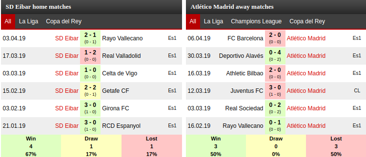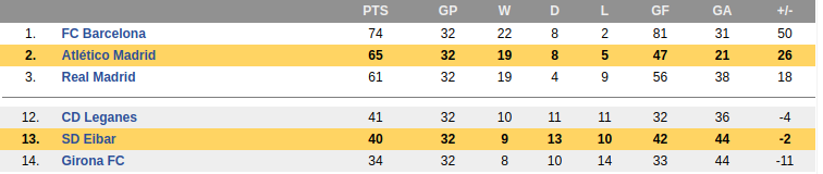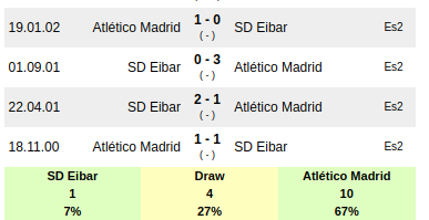 - Eibar are sitting in the thirteenth place on the table with points as they open their gates to the second placed Atl. Madrid with sixty-five points.