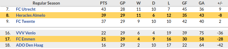 - The hosts are still stuck in the bottom three after just four wins thus far. Emmen are four points adrift from safety and one for a playoff.