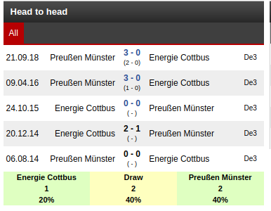 The two teams have drawn two games in the five games they have met with Preussen Munster winning two games and Energy Cottbus winning one game.