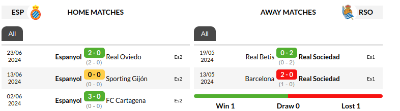 Real Sociedad, despite their loss to Rayo Vallecano, have shown their strength in recent encounters against Espanyol. They have dominated the head-to-head record, winning three consecutive matches and outscoring Espanyol 6-3 during that period.