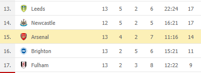 - The Gunners are languishing in the 15 th place with just four wins from 13 played , and a whooping 7 defeats thus far.
