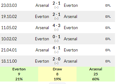 Overall, Arsenal have dominated this fixture with 25 wins compared to Everton 9.