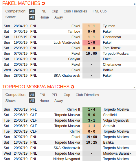 The two teams last met in the Russian cup in 2014 where torpedo Moscow recorded a 2-1 win after extra time.