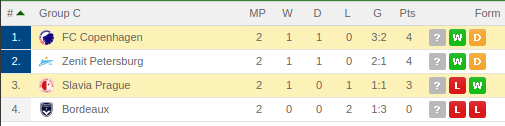 - Copenhagen will be aiming to maintain their top position on the group C table having scored three goals and conceded two.